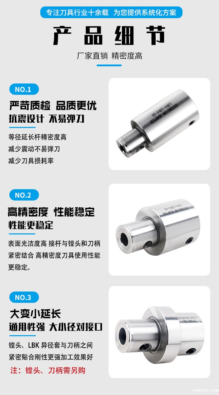 特点:等径延长杆适用于LBK、DCK、CK等系列的等径基础刀柄延长之用,异径延长杆适于深孔加大刀柄可变小径装镗头起到抗震作用。