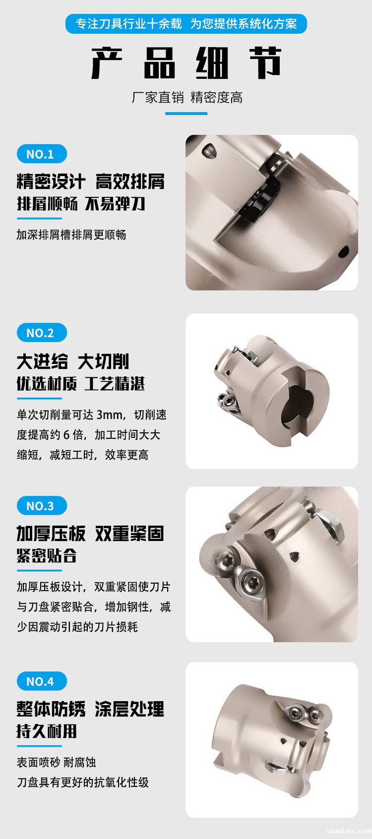 特点:整体预硬化,然后再精细加工,提高加工精度检查刀片和铣刀本体之间的间隙用塞尺小于0.02,刀片用完在轴向和径向方向≤0.03时,降低表面粗糙度和延长工具的寿命。