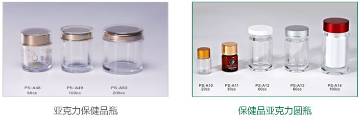 亚克力瓶透光率达92%以上,抗老化性能好。瓶子种类繁多,品相高端大气,广泛应用于保健品和化妆品包装等。