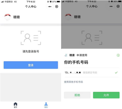 2. 初次登录的通行人员,需绑定微信账号,进入“穗康”小程序后点击“我的”,登录并授权绑定手机号码。