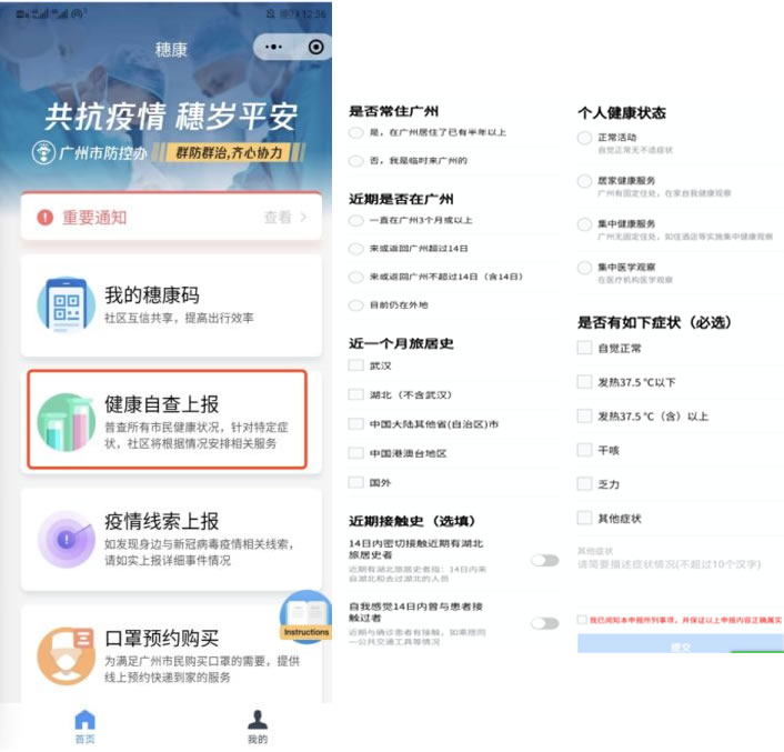 点击首页“我的穗康码”,点击“上报健康信息”,填写用户健康自查信息,包括基本信息、人员类型、是否有湖北旅居史、是否有如下症状、详细描述等信息。疫情防控关键时期,请务必如实填写。
