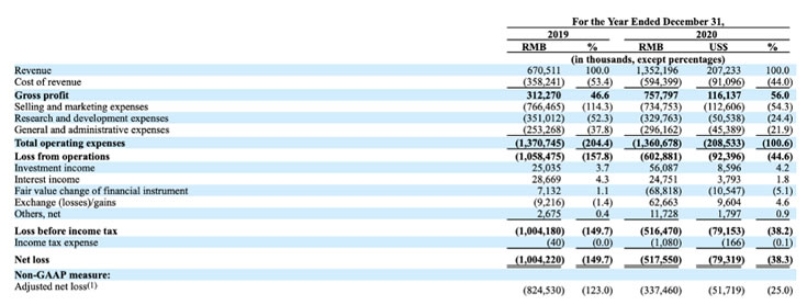 那么,这样一家稀缺的互联网公司,要如何撑起一个IPO?招股书显示,知乎2020年总营收为13.52亿,相比2019年营收6.71亿,同比增长101.7%;全年毛利为7.58亿,同比增长142.7%;全年毛利率为56%,同比增长20.2%。