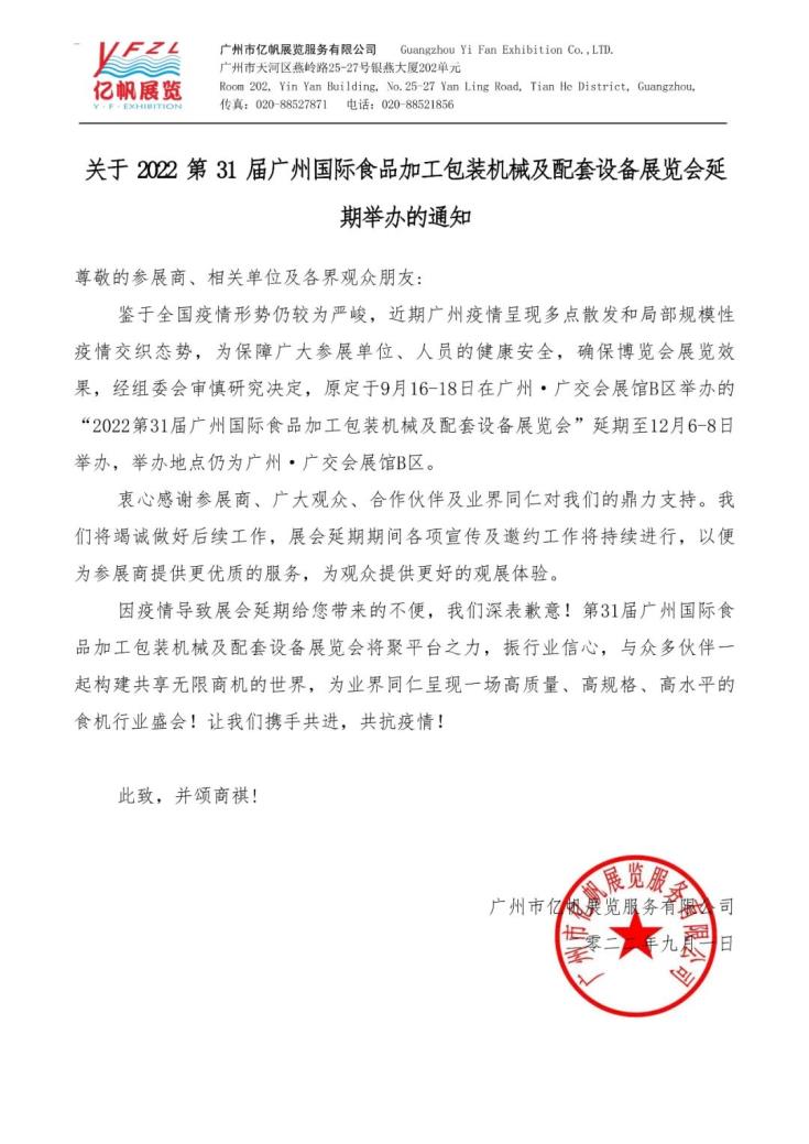 鉴于全国疫情形势仍较为严峻,近期广州疫情呈现多点散发和局部规模性疫情交织态势,为保障广大参展单位、人员的健康安全,确保博览会展览效果,经组委会审慎研究决定,原定于9月16-18日在广州·广交会展馆B区举办的“2022第31届必威官方首页官网电话查询号码”延期至12月6-8日举办,举办地点仍为广州·广交会展馆B区。