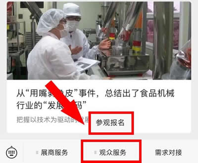 方法三:关注微信公众号“IFPE食机展”,点击下方菜单栏“观众服务”--“参观报名”即可进入报名系统。