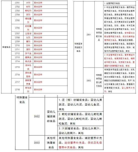 最新修订的"食品生产许可品种明细表"的变动并不大,影响最深的当属特殊食品。其中保健食品被细化为片剂、粉剂等18个类别;特殊医学用途配方食品增加了食物蛋白过敏全营养配方食品、难治性癫痫全营养配方食品及非全营养配方食品;特殊医学用途婴儿配方食品中增加了婴儿营养补充剂;特殊膳食食品中新增了运动营养补充品及孕妇及乳母营养补充食品。