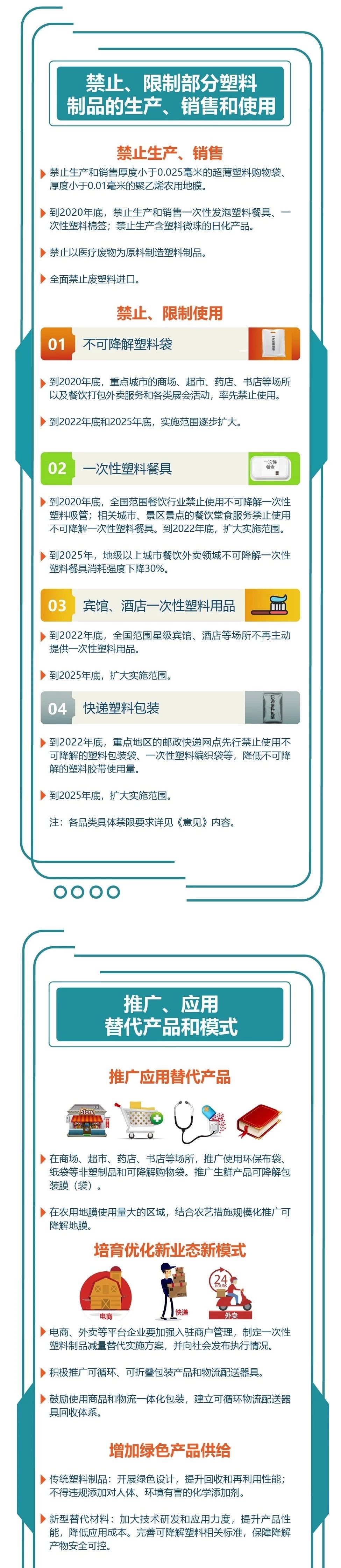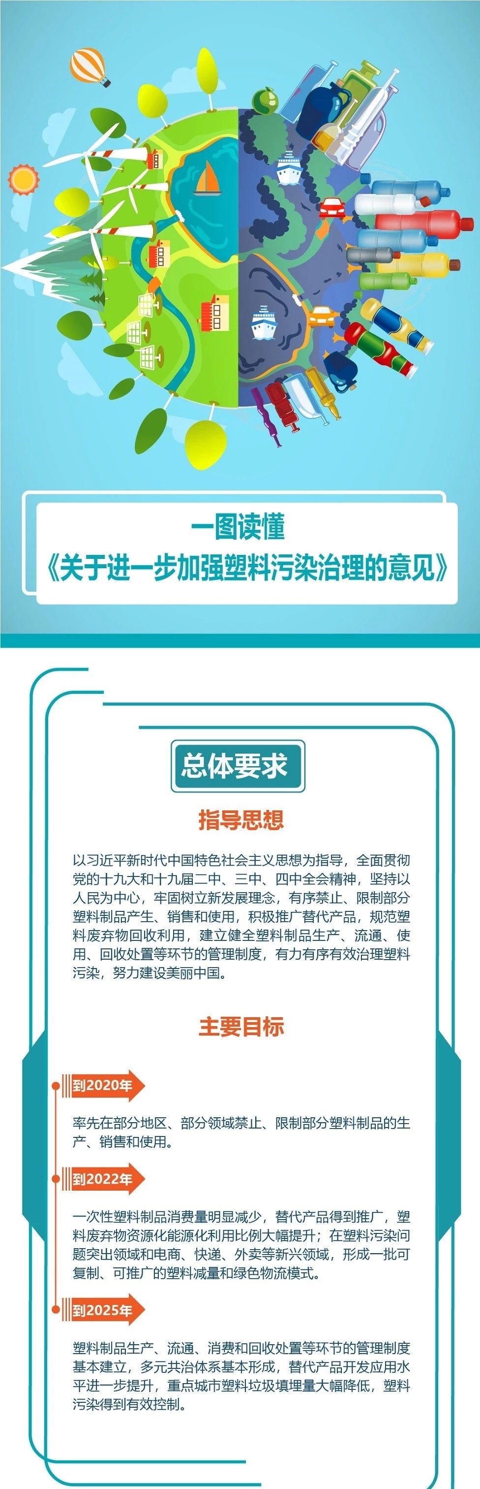 央视新闻1月19日消息,国家发展改革委、生态环境部今天(19日)公布《关于进一步加强塑料污染治理的意见》,到2020年底,我国将率先在部分地区、部分领域禁止、限制部分塑料制品的生产、销售和使用,到2022年底,一次性塑料制品的消费量明显减少,替代产品得到推广。