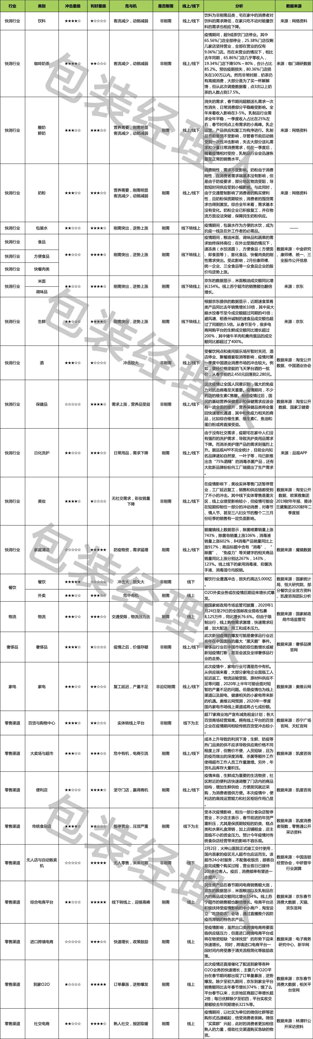 根据网络资料,我们总结了疫情对行业和渠道的影响。从表格中可以看出,受疫情影响严重的是非刚需产品和线下渠道。而在本次疫情中逆势上涨的是线上渠道,以及以社交渠道和电商为主的APP和零售店。