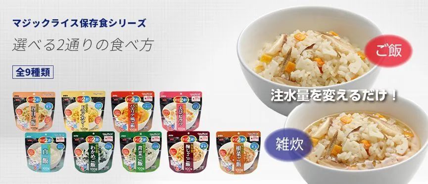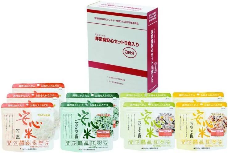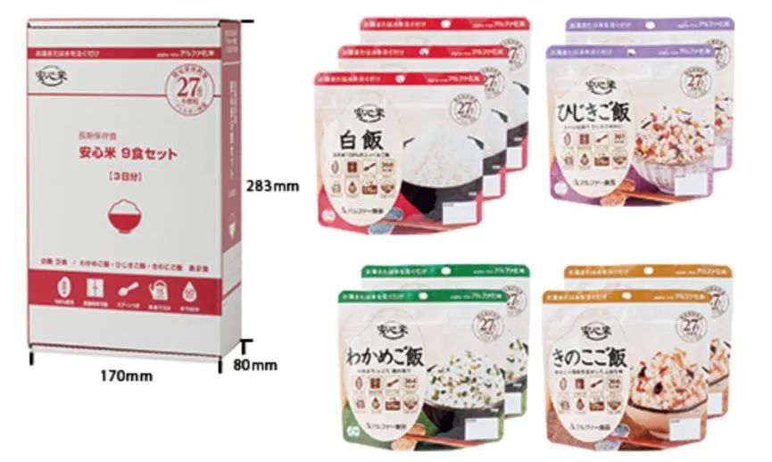 アルファー食品株式会社为防灾需要特别推出“安心米”系列,将生米煮熟后立即通过热风干燥。这款安心米包装,达到可以储存5年的效果,袋装方便携带,盒装则便于直接加热水冲泡。