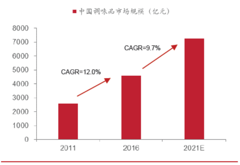 根据Frost & Sullivan 的数据,2011-2016 年我国调味品市场规模从2588 亿增长至4568 亿元,CAGR为12.0%;预计2016-2021 年的CAGR 为9.7%,保持稳健增长趋势,至2021 年市场规模将达到7270 亿元。