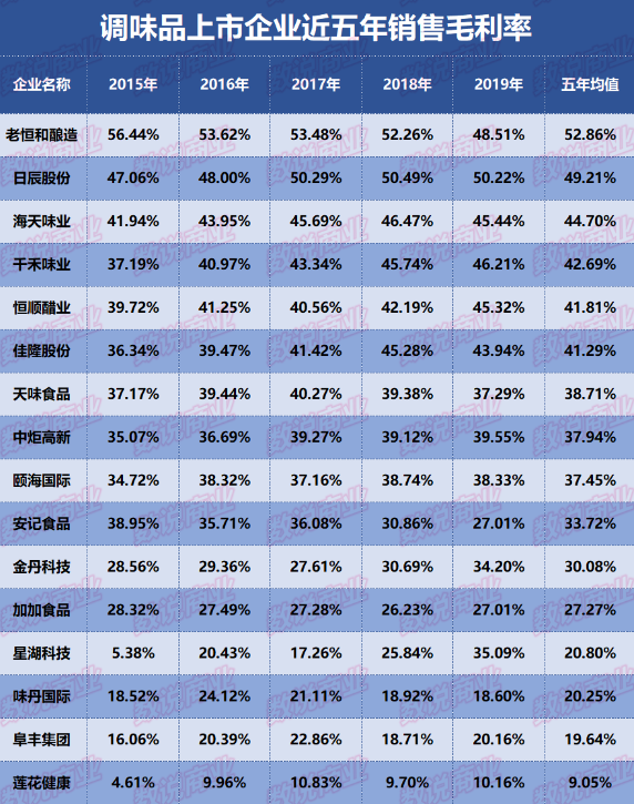 从近五年销售毛利率来看,有14家企业近五年平均销售毛利率在20%以上,老恒和酿造、日辰股份、海天味业、千禾味业、恒顺醋业、佳隆股份等6家企业超过40%。