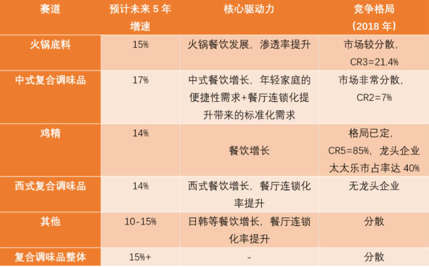 在复合调味品五大品类中,火锅底料和中式复合调味品发展潜力最大。