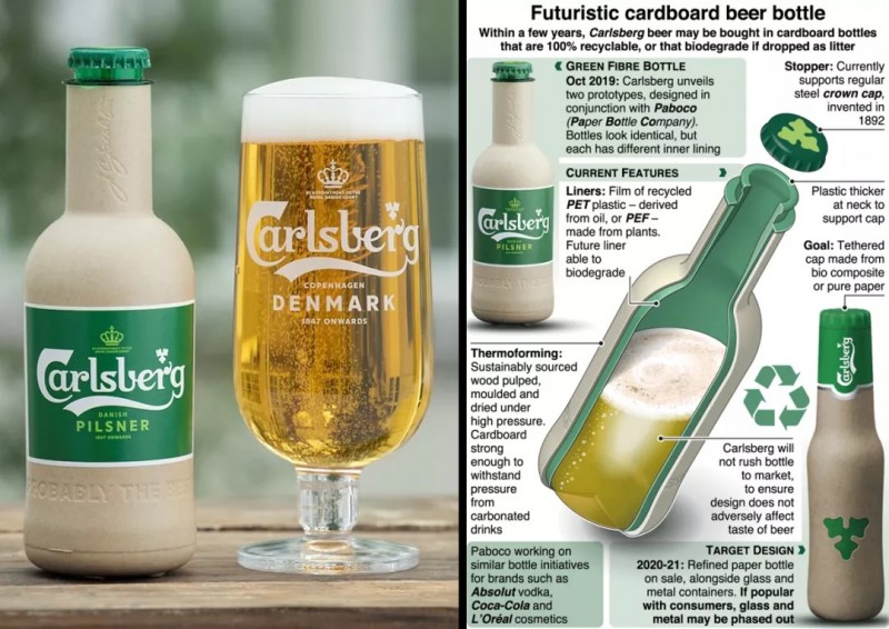 在2019年的C40全球市长峰会上,嘉士伯全球首款纸制啤酒瓶惊艳亮相。这款纸酒瓶也成为嘉士伯 “Together towards zero initiative(共同达成零排放倡议)”的关键部分,该倡议承诺公司到2030年实现啤酒厂零碳排放,并将整个价值链的碳足迹减少30%。