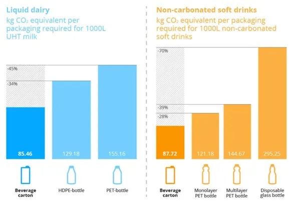 SIG发布的纸盒、塑料瓶与玻璃瓶碳足迹对比。