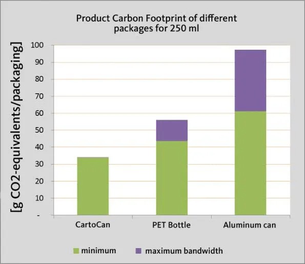 CartoCan®在环保上的表现同样毋庸置疑。与PET相比,Cartocan®的主要优势在于其重量不足PET的一半。而与铝相比,Cartocan®的主要优势在于碳排放量。同样容积下,使用50%可再生原料的Cartocan®罐所产生的温室气体排放量比铝罐要少40%。