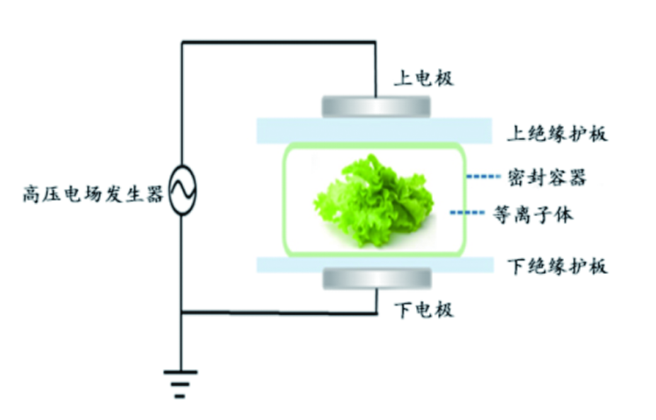 高压电场低温等离子体冷杀菌技术是国际上一种新型高效冷杀菌技术,近年来在食品杀菌领域受到越来越多的关注。该技术的原理如下图所示,是在电极之间放置密封包装的食品,通过对电极施加高压,激发电极板内空气产生活性氧、活性氮和紫外线光子等活性成分,这些活性成分具有良好的杀菌作用,可与食品表面微生物接触,对细胞DNA、脂质、蛋白质、细胞膜等造成损伤,从而引起微生物失活死亡,达到杀菌效果。同时,这些活性成分的存留时间较短,半衰期较长的臭氧及其他活性成分在24小时内会逐渐转变为基态,不会有化学品的残留。