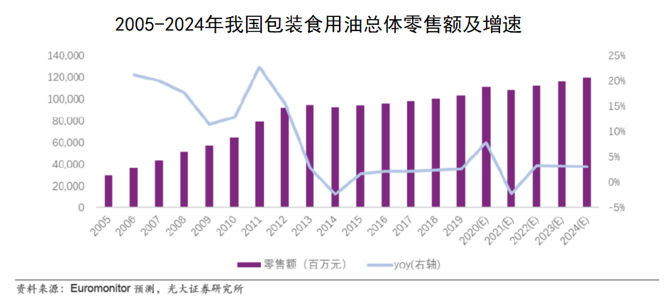 2019 年我国包装食用油总体零售额为1031 亿元。根据Euromonitor 的预测,2020 年由于疫情原因,消费者增加食用油的购买,导致食用油零售市场规模同比增长约8%,2021 增速将跌至2%左右,2022-2024 年增速将保持在3%。