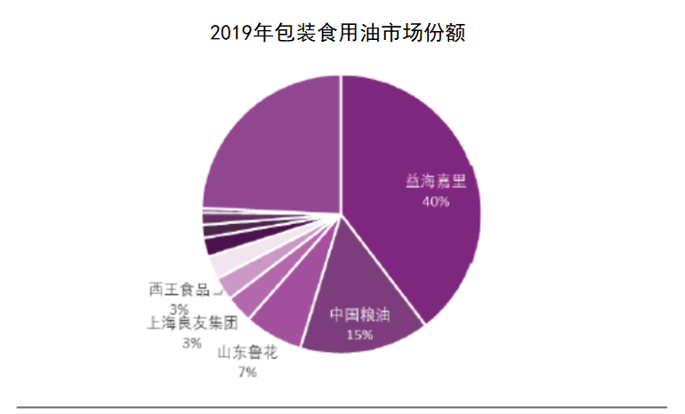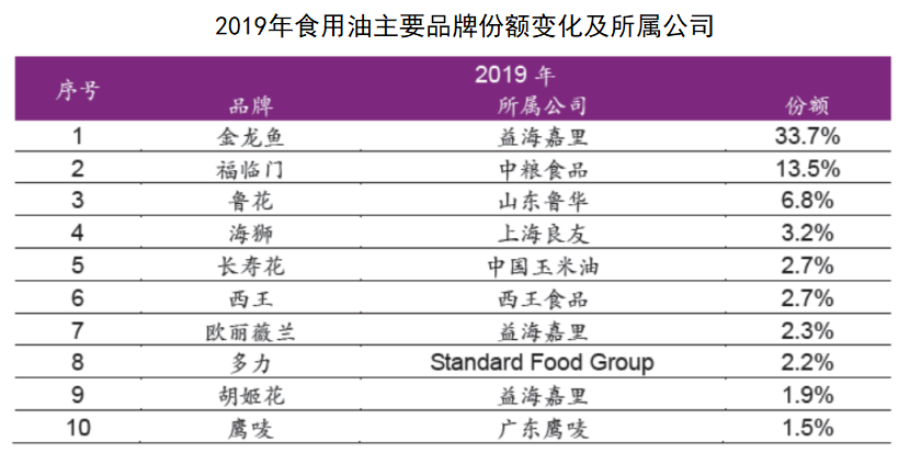 2014-2019 年期间,前十品牌也基本稳定,市占率由2014 年的64.7%进一步提升至2019 年的70.5%。具体看,益海嘉里旗下的金龙鱼稳居首位,2019 年市场份额达到33.7%。除金龙鱼外,益海嘉里旗下欧丽薇兰、胡姬花也进入了前十。