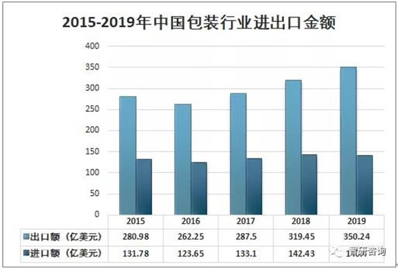 随着我国对外贸易规模的不断扩大,包装行业出口市场也表现活跃。我国包装行业出口不断增加。2019年中国包装行业出口金额为350.24亿美元,同比增长9.64%;中国包装行业进口金额为140.4亿美元,同比下降1.43%。