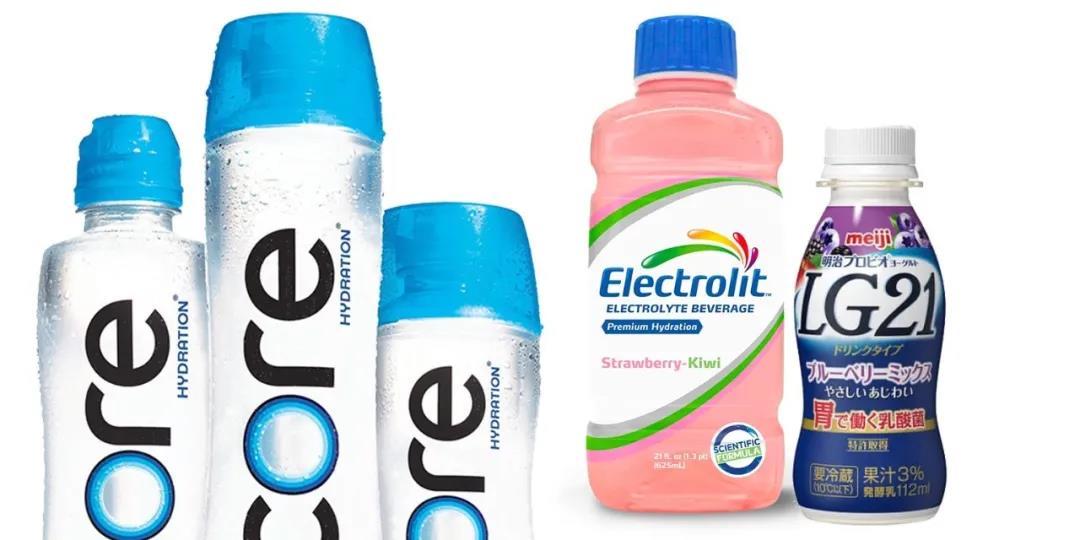 来自世界各地的健康饮料举例:Core Hydration(美国),Electrolit Water(墨西哥),明治酸奶(日本)。