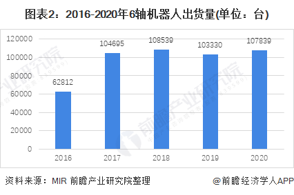 作为工业机器人主要产品的多关节机器人中,6轴机器人是其中的主要产品,2016-2020年6轴机器人的出货量整体呈增长趋势,近年来变化较为稳定,在2020年时出货量达到107839台。