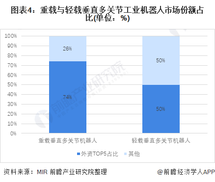 在国内市场上,我国的垂直多关节工业机器人国产化程度不高,尤其是重载垂直多关节工业机器人中外资厂商占比高达74%。总体来看,垂直多关节工业机器人为主要产品,且国产化程度有待提高。