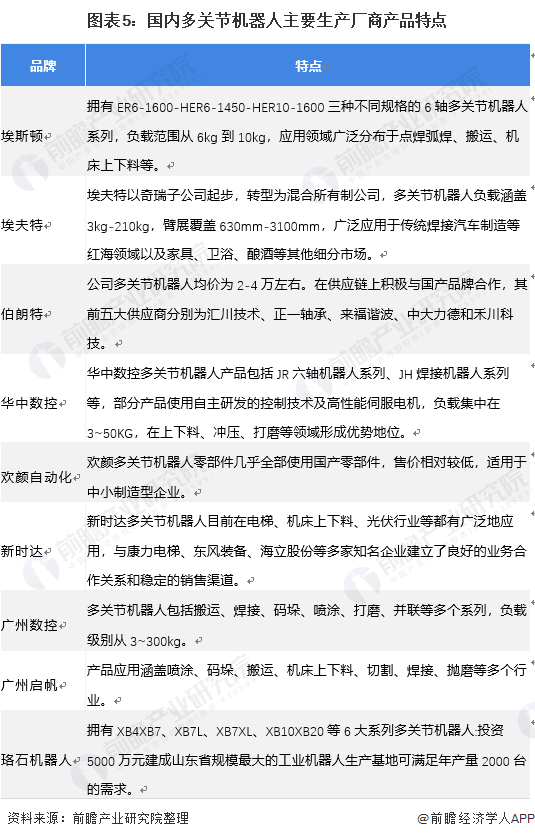虽然目前国内垂直多关节机器人主要被外资厂商占领,但是国产企业正在加快国产替代进程,诸如埃斯顿、埃夫特、 伯朗特等著名机器人厂商在垂直多关节机器人方面也有所发展,具体情况如下: