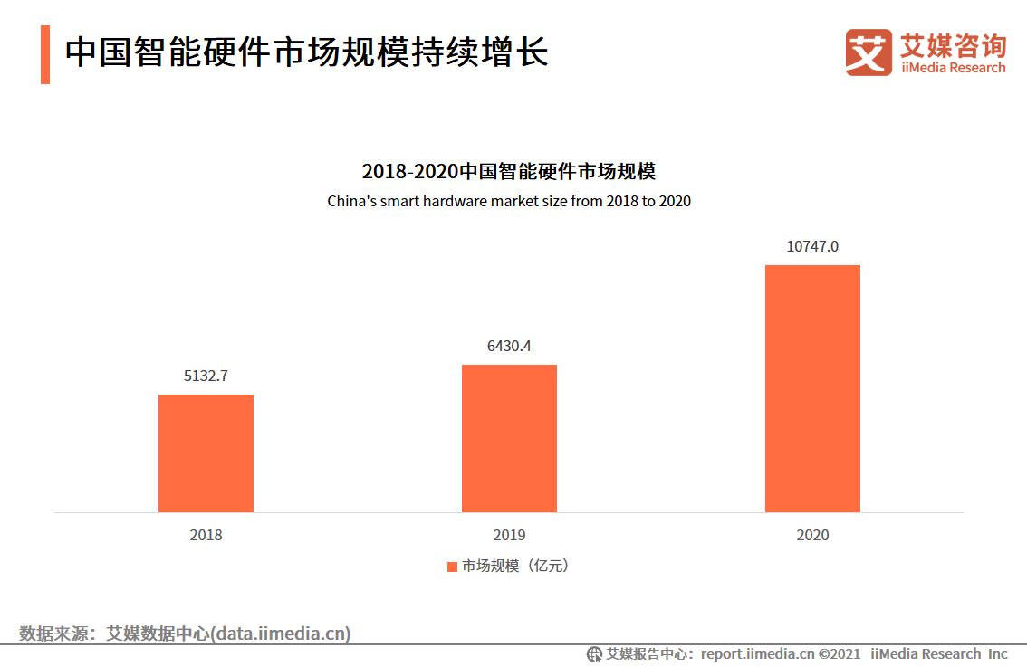 中国智能硬件行业利用传感器等硬件技术对工业设备进行智能改造,赋予设备大数据等附加价值,市场规模逐步上涨,从2018年的5132.7亿元上涨至2019年的6430.4亿元,在2020年市场规模以同比67.1%的增长率扩张至10747.0亿元。艾媒咨询分析师认为,随着公有云和信息传输技术的发展,已经逐步普及“云+端”技术模式的智能硬件市场将进一步扩张。