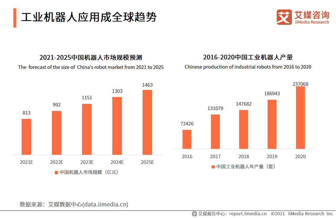 iiMedia Research (艾媒咨询)数据显示,中国机器人市场规模将在2021年达到813亿元,随后四年里也将保持增长势头,在2025年将涨至1463亿元;而中国的工业机器人产量也从2016年的72426套扩张至2020年的237068套。24小时高效工作、智能化、数字化的工业机器人的应用逐渐成为制造业产业的主流趋势。