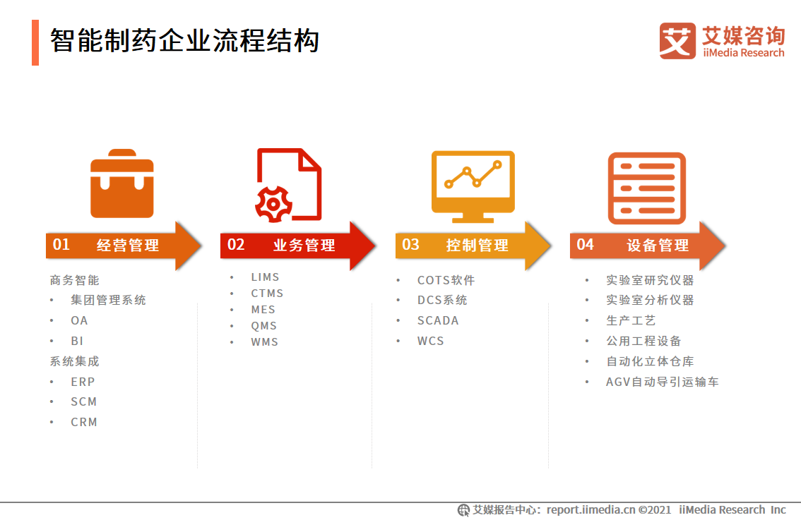 智能制药企业涉及企业资源管理系统(ERP)、制造执行系统(MES)、传感器、执行器等多个系统,各系统环环相扣,与技术和流程方面的相互依赖。具体分为包含集团管理系统、OA、ERP等的经营管理层面、包含LIMS、CTMS、MES等的业务管理层面、包含COTS软件、DCS系统等的控制管理层面和包含实验室研究和分析仪器等的设备管理层面。