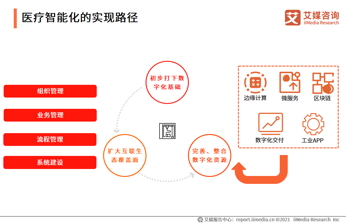 医疗行业智能化是个漫长的过程。企业应当根据自身发展情况和规划,将智能制造纳入企业发展战略计划中。在某些板块达成互联的情况下,为数字化打下基础,实现更深层次的应用,并延伸至更高管理层级的扩大互联生态覆盖面阶段。根据企业自身情况进行的完善整合资源等阶段目标,利用边缘计算、数字化交付等技术进行数据采集、信息交流和储存,最大化利用技术资源,通过进行组织管理、业务管理、流程管理和系统建设的革新分阶段推进。