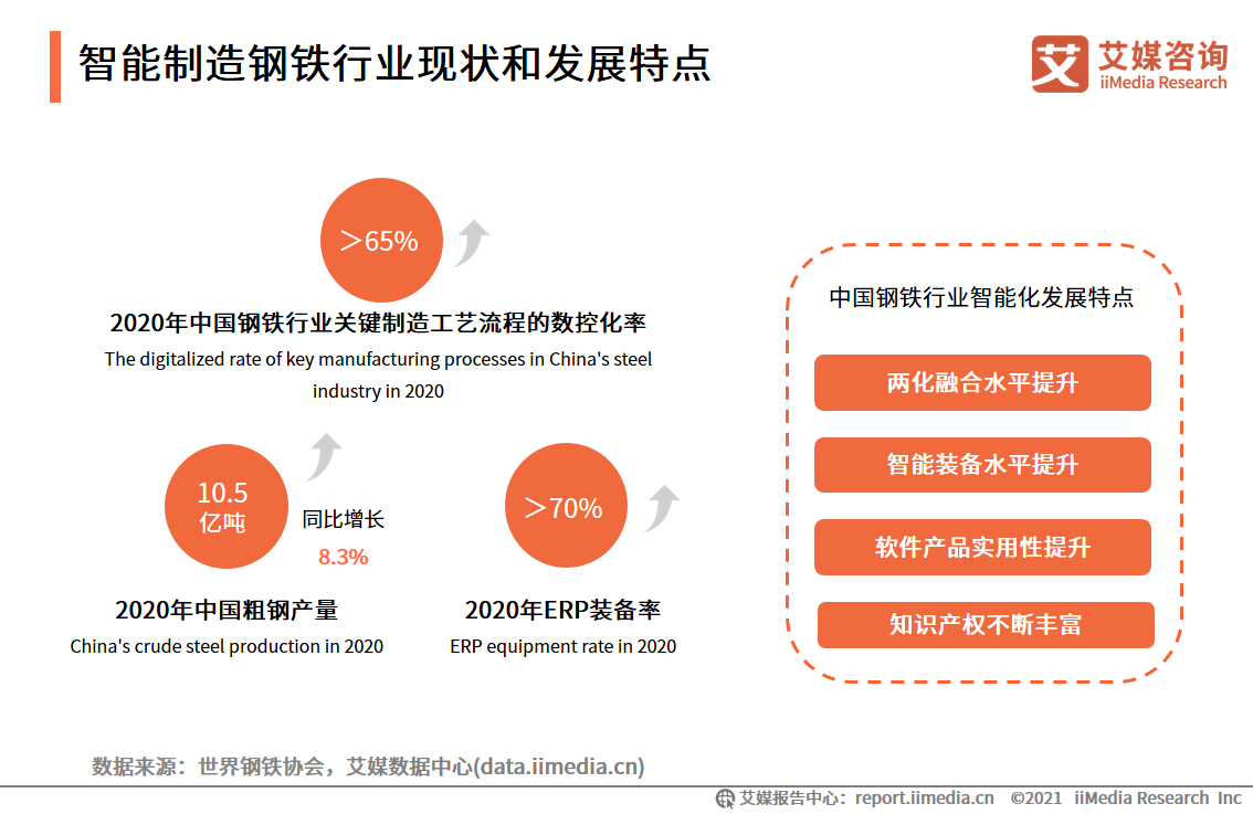中国已成钢铁生产大国,数据显示,2020年中国粗钢产量达到10.5亿吨,同比增长8.3%。同时中国钢铁制造行业信息化程度大大提高,关键制造工艺流程的数控化率超过65%,而ERP装备率也超过了70%。在中国钢铁制造行业与数字服务商的共同努力下,中国钢铁制造行业在产量和生产流程数字化上都有很大的进展,数字化和智能化融合、智能装备水平都显著提升,工业软件不断推陈出新,知识产权也更加丰富。