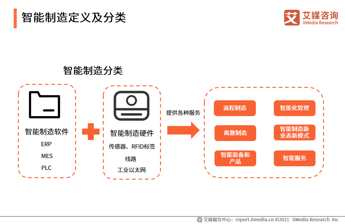 综合来说,智能制造分为软件和硬件。智能制造软件系统主要包括制定计划、调配资源的ERP系统,以及负责信息传递的PLC系统和连接ERP、PLC等系统、控制生产的MES系统;智能制造硬件主要包括采集信息的传感器、RFID标签和传输信息的线路、工业以太网。智能制造企业主要提供流程制造、离散制造、智能装备和产品、智能化管理、智能服务和智能制造新业态模式等服务。