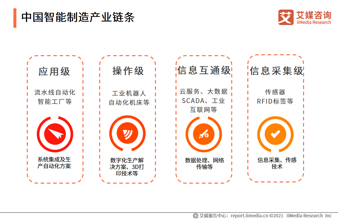 中国智能制造产业主要分为四个层级,分别为包括流水线自动化、智能工厂等,主要属于系统集成及自动化生产的应用级别;包括工业机器人、自动化机床,提供数字化生产解决方案等服务的操作级;云计算、大数据、SCADA、工业互联网等数据传输技术隶属于的信息互通级;主要提供信息采集、传感技术的信息采集级。