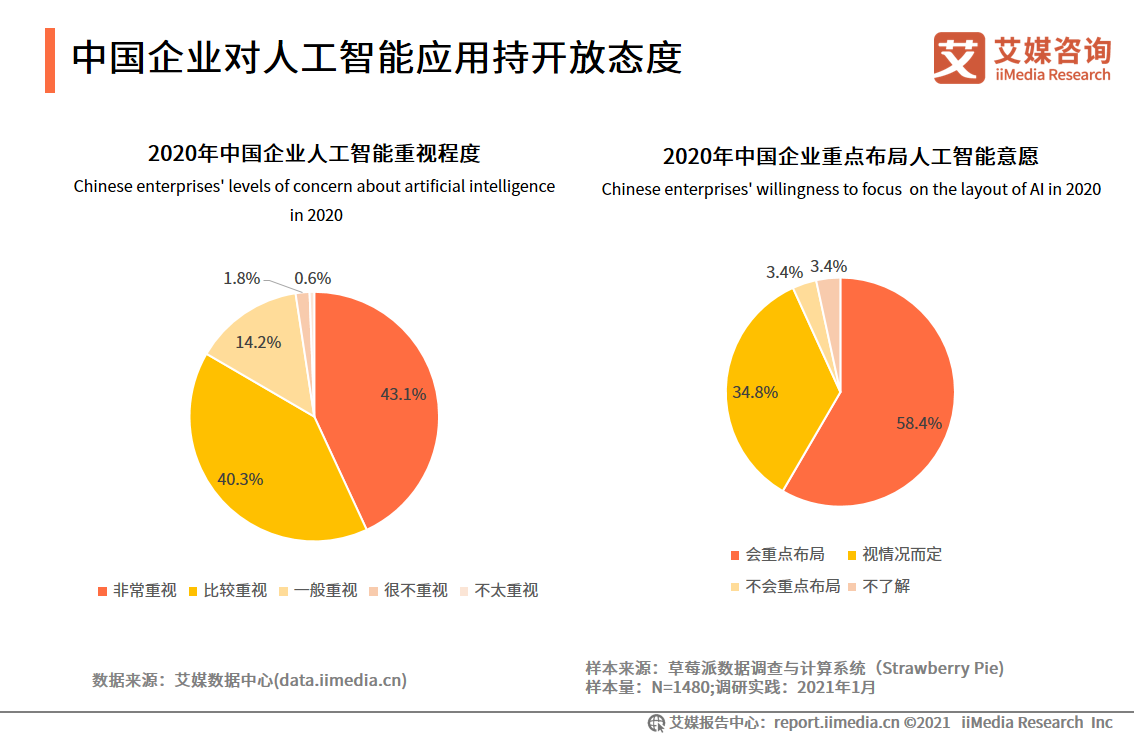 iiMedia Research(艾媒咨询)数据显示,2020年,43.1%的受访企业表示对人工智能非常重视,且超95%的受访企业表示重视人工智能成果的应用;58.4%的中国企业表示会重点布局人工智能领域。艾媒咨询分析师认为,中国企业界对人工智能应用持开放和总体乐观的态度,为该领域企业后续发展应用提供了良好用户基础。