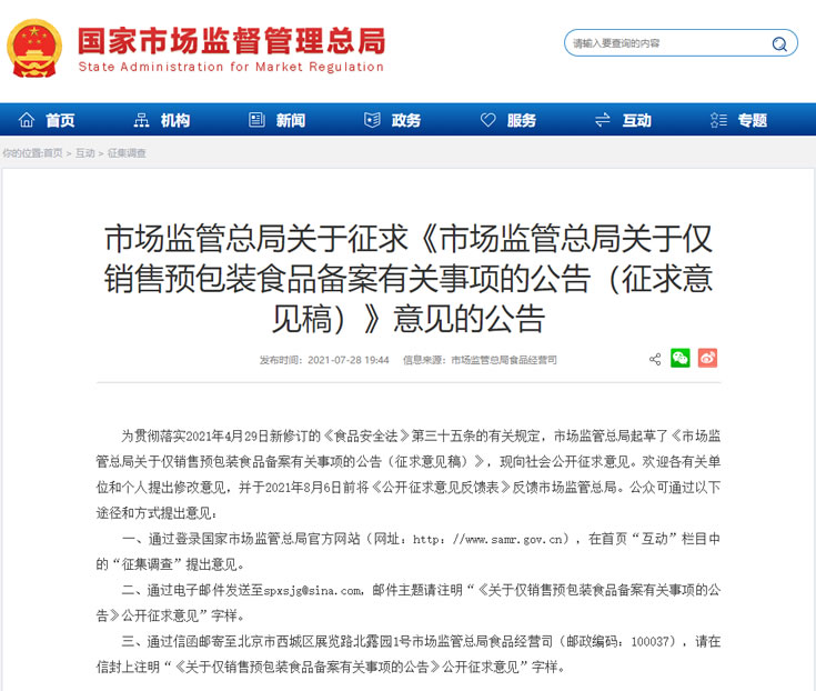 7月28日,市场监管总局发布《关于仅销售预包装食品备案有关事项的公告(征求意见稿)》,拟对仅销售预包装食品的食品经营者备案有关事项进行统一规范。