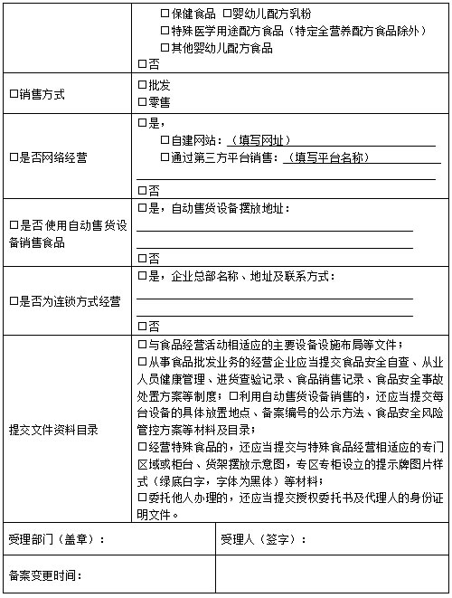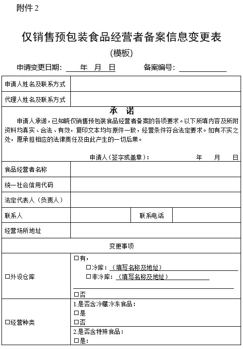 二、从事仅销售预包装食品活动的食品经营者应当具备与销售的食品品种、数量等相适应的经营条件。备案时,食品经营者应当填写《仅销售预包装食品备案信息采集表》,并提交相关文件资料及目录。备案信息发生变化的,应当自发生变化之日起15个工作日内向原实施备案的市场监管部门提交《仅销售预包装食品备案信息变更表》、与变更项目有关的文件资料和目录进行备案变更。终止食品经营活动的,应当自经营活动终止之日起15个工作日内,向原备案的市场监管部门注销备案。未及时注销备案的,市场监管部门可注销备案。食品经营者主体资格依法终止的,备案自动失效。