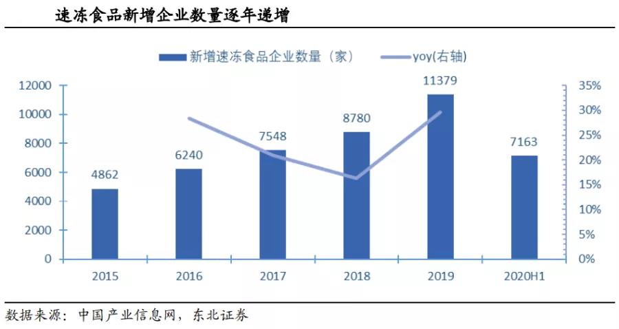 2020 年上半年国内新增速冻食品企业 7163 家,已达 2019 年全年新增数量的 63%。我国速冻食品企业数量呈现不断增加的发展态势,行业发展势头强劲。