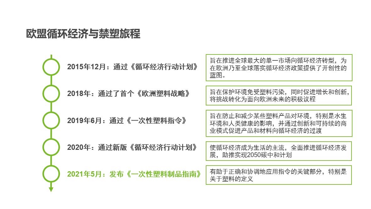 当我们回溯欧盟的相关法令可以发现,从2015年的《循环经济行动计划》到《欧洲塑料战略》、《一次性塑料法令》等等,对塑料的使用、限制都在一步步加强,欧盟通过推广环保新材料、开征塑料税、制定碳中和目标、重新定义塑料范畴等不同方式,力图对塑料的生产、使用、消费、回收形成一个闭环的管理和引导。