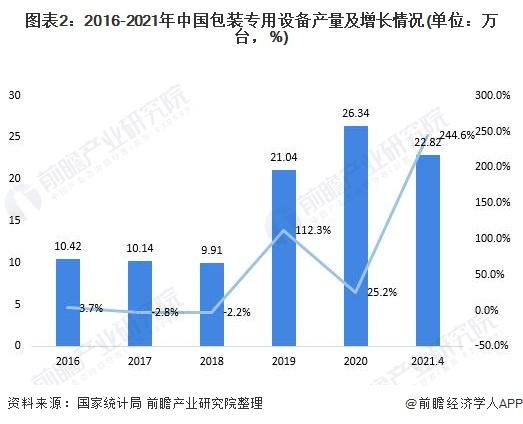 2019年以来,在下游食品、药品、日化等行业新增长点拉动下,我国包装专用设备产量逐年增长。2020年,我国包装专用设备产量达26.34万台,同比增长25.2%。截至2021年4月,我国包装专用设备产量为22.82万台,较2020年同期增长244.6%。