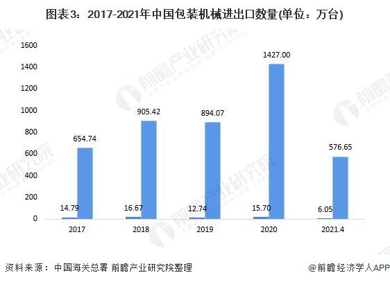 据中国海关总署统计数据,2018-2019年,我国进口包装机械在14万台左右,出口包装机械在900万台左右,2020年,我国包装机械进口数量为14.58万台,出口数量1427万台。可见,随着我国包装机械行业整体实力的不断提高,我国包装机械产品出口数量越来越多。