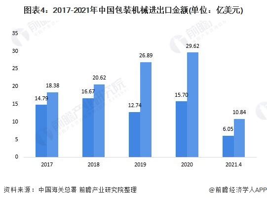 从进出口金额来看,我国包装机械进口金额波动变化,出口金额逐年增长。2020年我国包装机械进口总额达15.70亿美元,出口金额达29.62亿美元。