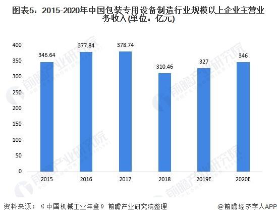 根据2020年1月发布的《中国机械工业年鉴2019》,截至2018年底,我国包装专用设备制造行业规模以上企业有319家,主营业务收入达310.46亿元,同比增长6.14%。结合我国包装专用设备制造产量及进出口情况,测算我国包装专用设备制造行业的市场规模约为346亿元。
