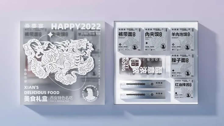 银灰色的礼盒营造出高级质感,封面排版采用不同类型的字体设计来区分产品信息。版面还结合了传统剪纸,给每款面食都搭配有相应的瑞兽形象,刺激人们对产品的味觉联想。