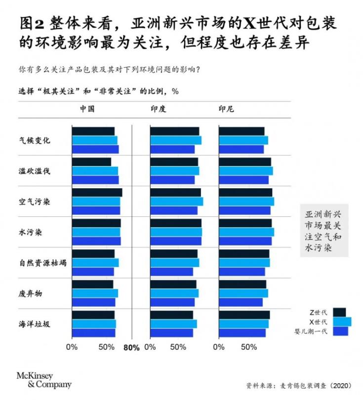 当深入研究第二个问题,探究是哪个群体在助推这些担忧时,我们发现所有受访年龄群体都很关注这些问题。整体来看,X世代的关注程度最高,其次是Z世代/千禧一代和婴儿潮一代(见图2)。具体到空气和水污染这两个主要领域,印尼的X世代对此尤其关注,而中国和印度的情况差异较大。