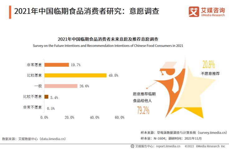 数据显示,有69.5%的中国临期食品消费者表示,未来愿意继续购买;近八成的临期食品消费者表示愿意向他人推荐。艾媒咨询分析师认为,中国临期食品消费者对临期食品的消费意愿较为强烈,高性价比的特点吸引消费者进行消费,并且愿意向他人推荐此类高性价比的产品。