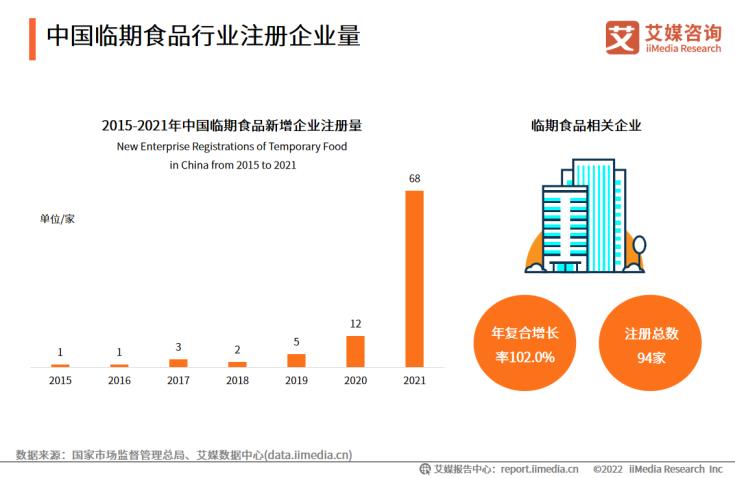 数据显示,截至2021年,我国临期食品相关企业总注册量达94家,市场竞争加剧。2021年临期食品行业企业注册量激增,远多于往年新注册企业数量。