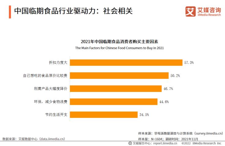 数据显示,中国临期食品被购买的前三大因素是:折扣力度大(57.3%)、食品原价较贵(50.2%)、刚需产品大幅降价(46.7%)。艾媒咨询分析师认为,年轻消费群体成为临期食品主要消费群体,并且低价、折扣大、实惠等理念渗透到年轻消费群体,临期食品市场需求进一步扩大,推动市场发展。