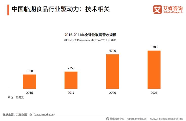 随着科技发展,物联网技术将保质期信息写入射频贴纸,实现临期食品自动拣选、自动发货,提升临期食品安全性和出货效率。2021年全球物联网营收规模已达到5200亿美元,临期食品安全标准将进一步得到提升。