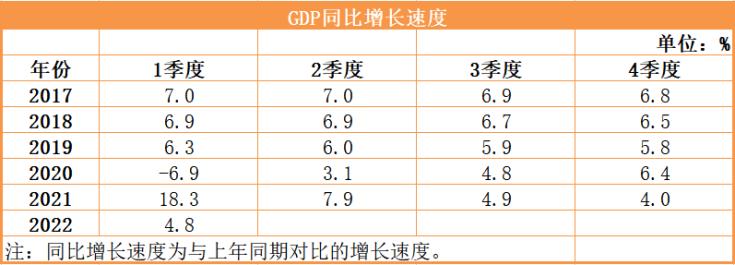 国家统计局最新发布,2022年一季度中国国内生产总值270178亿元,按不变价计算,同比增长4.8%,比2021年四季度环比增长1.3%。