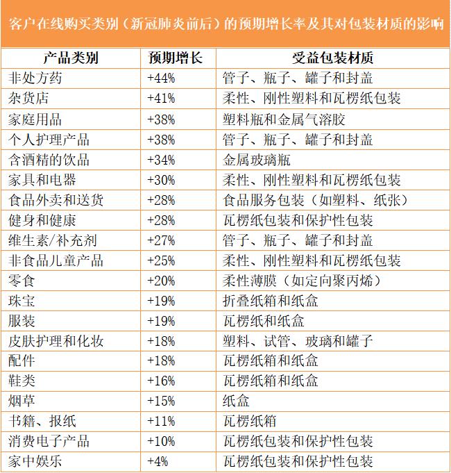 预计几乎所有消费品类别都将实现线上购买的持续增长,特别是非处方药、日用商品、家庭用品和个人护理产品。下图显示了麦肯锡和Mesirow基于美国消费者的数据,这些包装形式有望受益最大,包括瓦楞运输纸箱、其他形式的保护性包装、柔性薄膜、硬质容器、塑料瓶和塑料管、金属气雾罐和罐子。